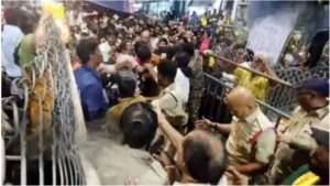 आंध्र प्रदेश अमरावती! आंध्र प्रदेश के श्रीकाकुलम जिले के कासिबुग्गा स्थित वेंकटेश्वर स्वामी मंदिर में शनिवार सुबह देवउठनी एकादशी पर उस समय चीख-पुकार और भगदड़ मच जब श्रद्धालु बदहवास होकर भाग रहे थे और भीड़ एक-दूसरे को कुचल रही थी। इस भगदड़ में 10 श्रद्धालुओं के मरने की खबर है और अन्य कई घायल हैं। घायलों को इलाज के लिए अस्पताल में भर्ती कराया गया है। वीडियो फुटेज देखकर लगता है कि यह घटना मंदिर के संकरे सीढ़ीनुमा रास्ते पर भीड़ के दबाव में हुई थी। उस वक्त वहां हजारों भक्त पूजा-अर्चना के लिए एकत्र हुए थे कि अचानक भगदड़ मच गयी।